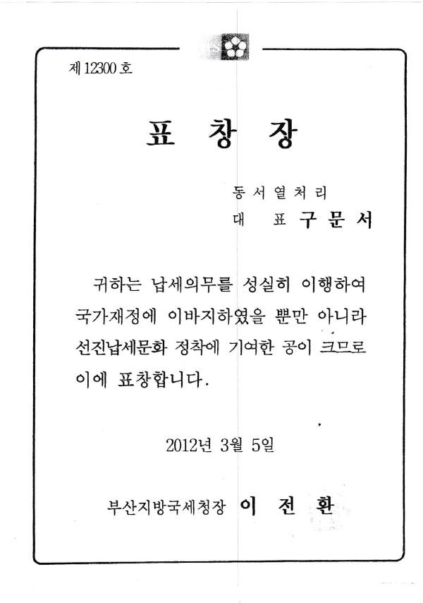 납세 의무 표창장(부산지방국세청상 표창 - 2012년)