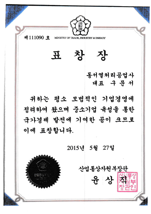 산업통상자원부장관상(모범중소기업인상 표창 - 2015년)