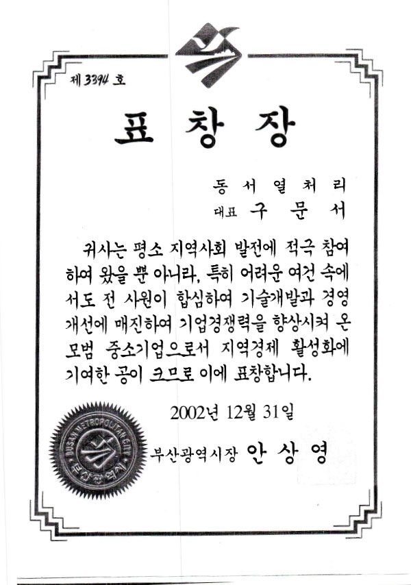 부산광역시장상 (기술혁신 및 경영혁신 표창 - 2002년)